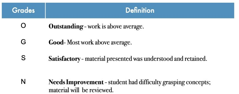 On the Report Card, list grades only for subjects that are taught in that quarter or semester. Do not grade subjects you have not taught. Not all subjects on the Report Card have to be taught at every grade level. (See Course Criteria-Requirements Section)