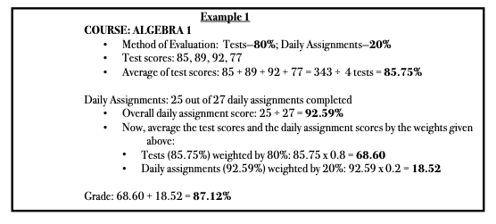 Determine at the beginning of the course what percentage of the grade each category will receive. Then use the individual scores from each category and take a weighted average using the percentages that you have assigned. Shown below are sample grade calculations for an
