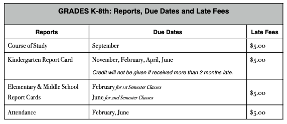 A $5.00 fee per sheet of paper, per month, per student will be charged for all late paperwork. If paperwork is not received by the 2nd month you will be contacted by the office. Due dates are listed below for your convenience, but these dates are subject to change.