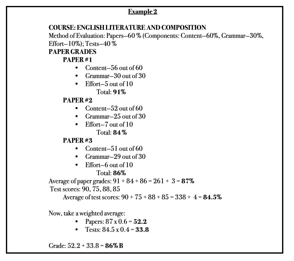 Determine at the beginning of the course what percentage of the grade each category will receive. Then use the individual scores from each category and take a weighted average using the percentages that you have assigned. Shown below are sample grade calculations for an